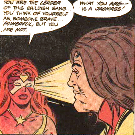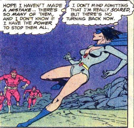 She would use her pow­ers in two dif­fer­ent scenes in this issue, a rar­i­ty for this fast-paced sto­ry­line. The first time was before she knew of the men­ace of the Evil Eight and their boss, the Mas­ter: a friend of her was being attacked by a gang and she trans­formed to defend him, using her hyp­not­ic pow­ers to make the leader of the gang act like a donkey.