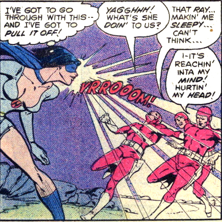 Hyptel­la’s hyp­not­ic pow­er was pro­ject­ed through her eyes. Even after this short of time, Vic­ki was now more con­fi­dent in using her pow­ers, plus more will­ing to use them in non-super sit­u­a­tions, espe­cial­ly here. (She could also fly, which her pre­vi­ous hyp­not­i­cal­ly-themed hero­ine was unable to do.)
